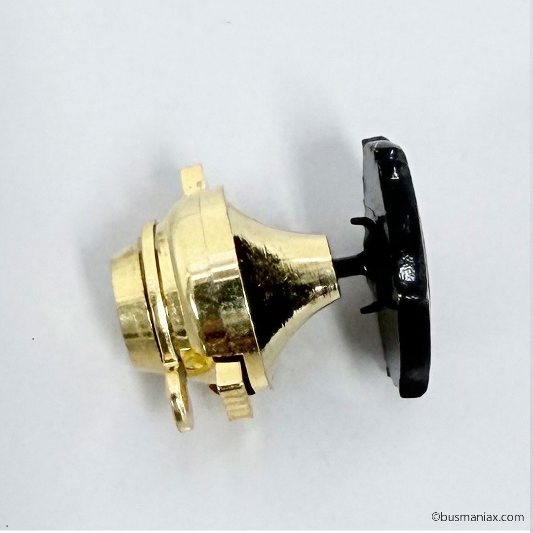 懐かしさを感じる、旧中国バスの社章です。黒を基調にゴールドでロゴマークをあしらい、重厚感のあるデザインになっています。